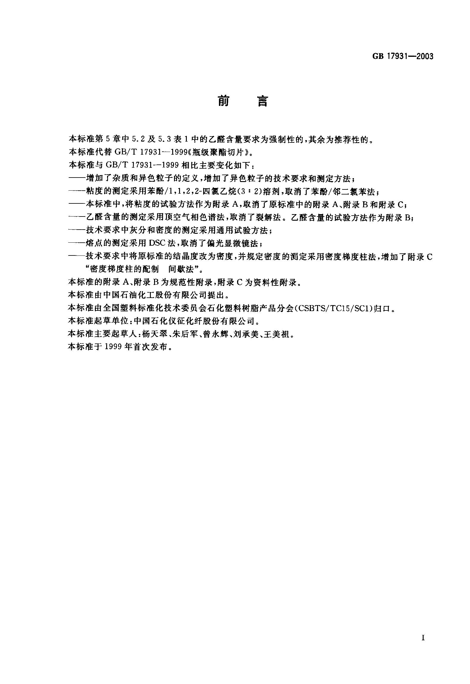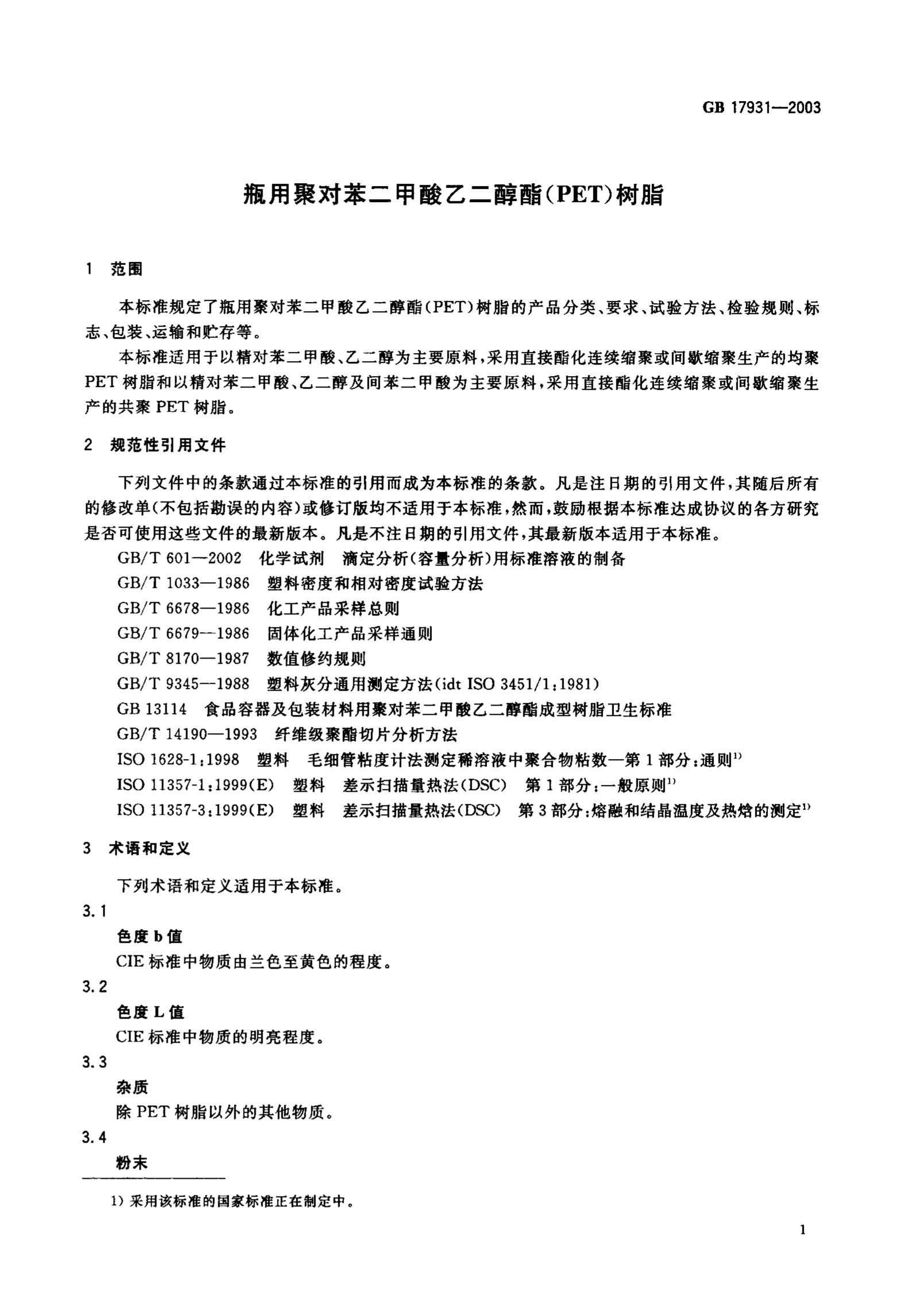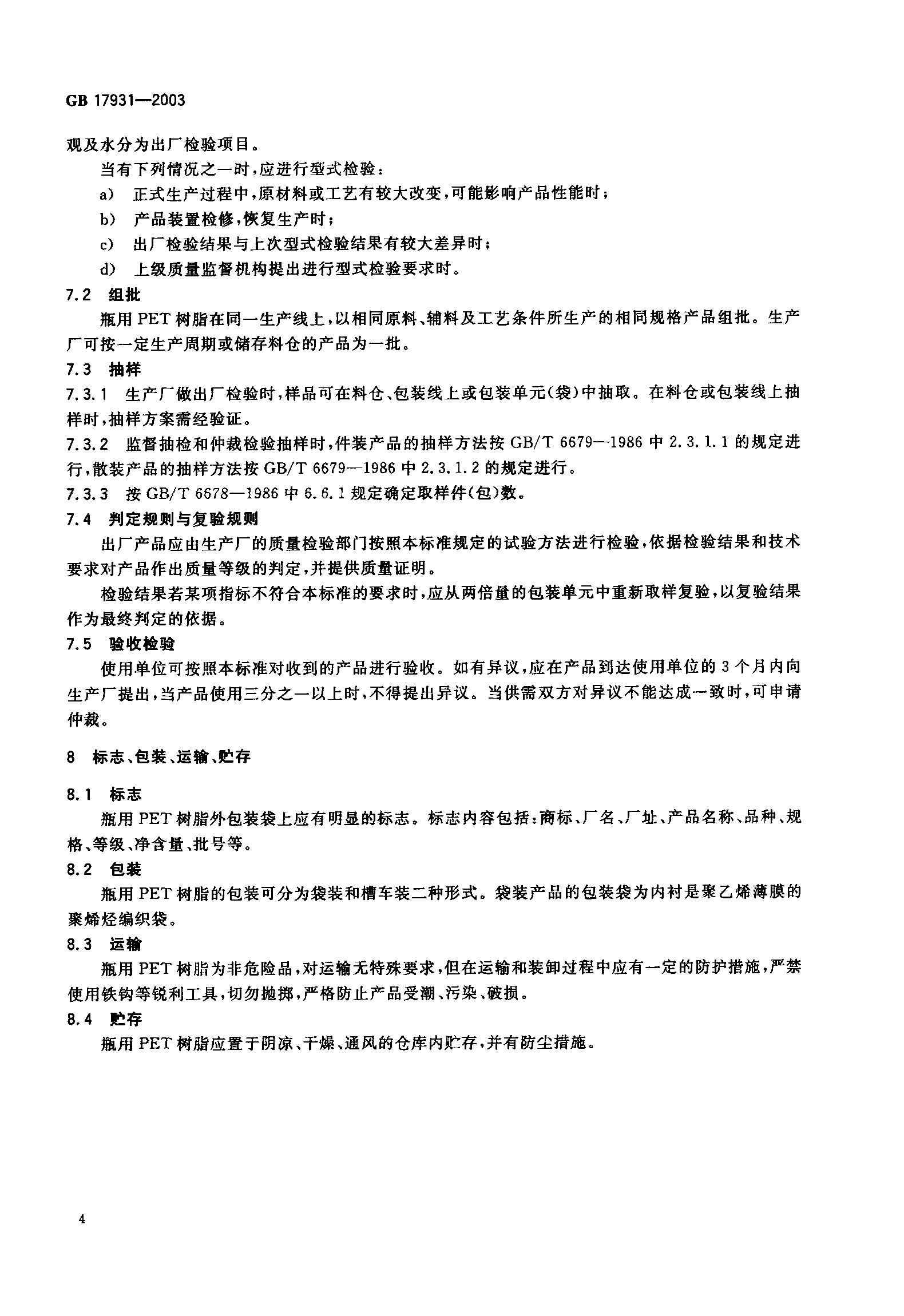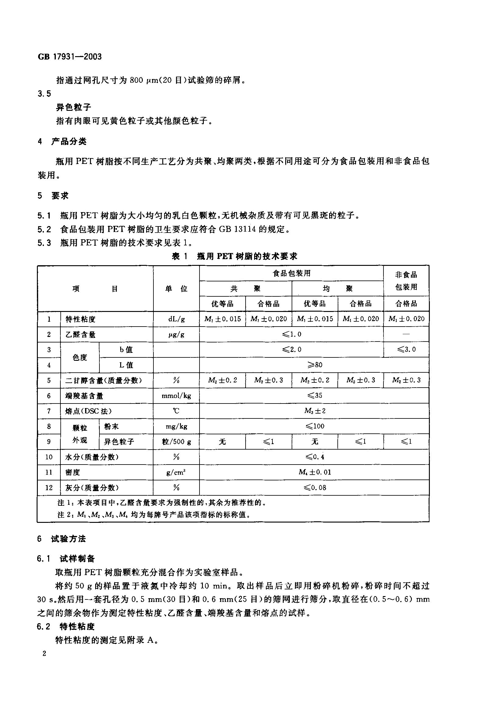 GB17931-2003瓶用聚对苯二甲酸乙二醇酯(PET)树脂